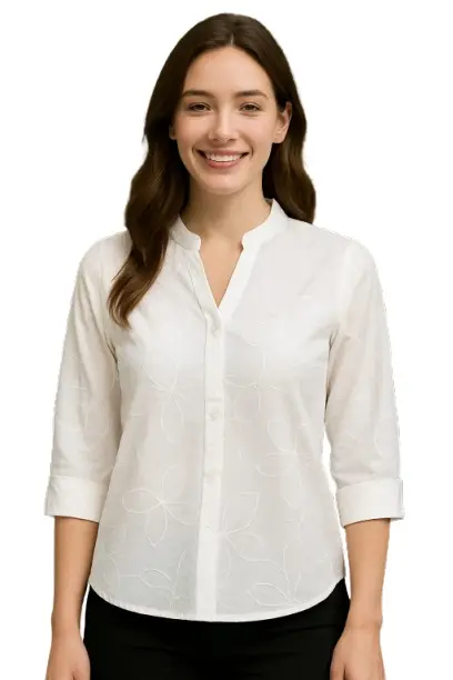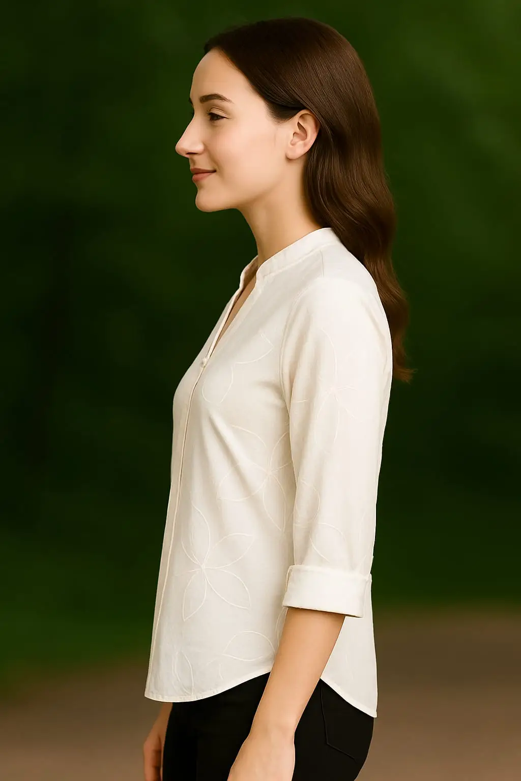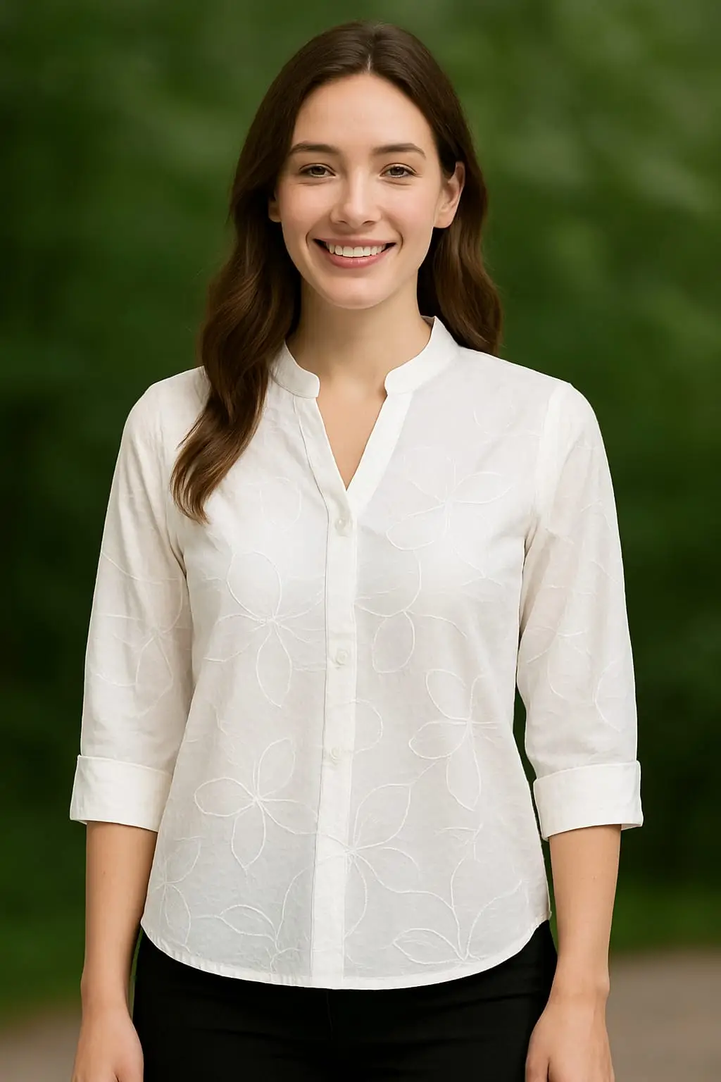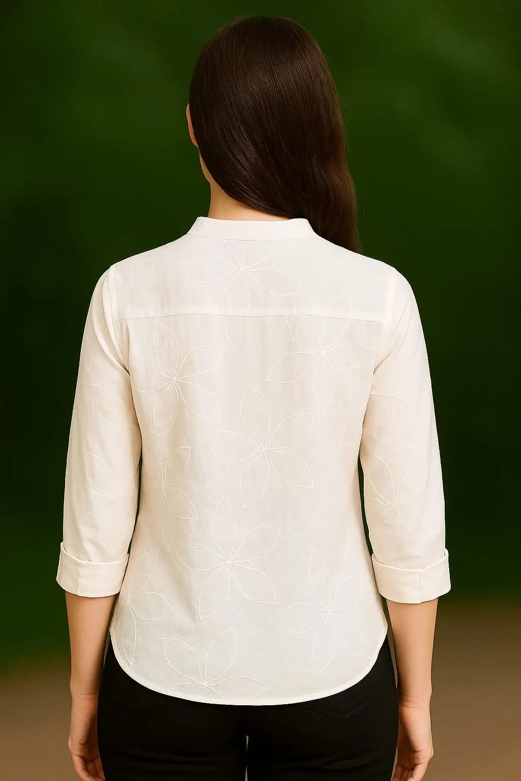 Upgrade your wardrobe with our elegant White Cotton Casual Shirt for women. Designed for comfort and everyday style, this shirt features breathable fabric, subtle embroidery, and 3/4 sleeves – perfect for office or casual wear.